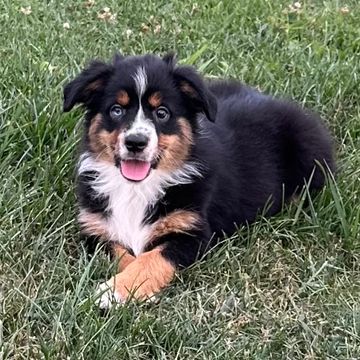 Ainsley outdid herself with her beautiful babies. This black tri male would fit into any home. He is very loving and is showy with his extra white. If you like a stout built Mini you have to meet this one. He is ready to go.